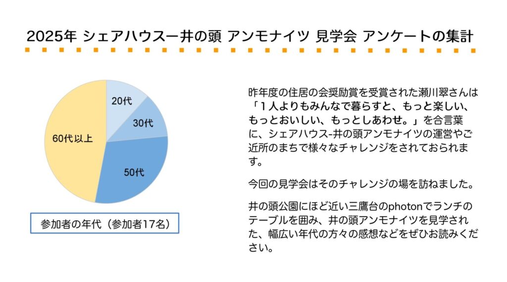 - 夢に向けてどんどん行動される瀬川翠さんのパワーに圧倒されました。若い人たちの力で三鷹台の街が変身していく姿にもびっくりしました。見学会を企画してくださり、ありがとうございました。