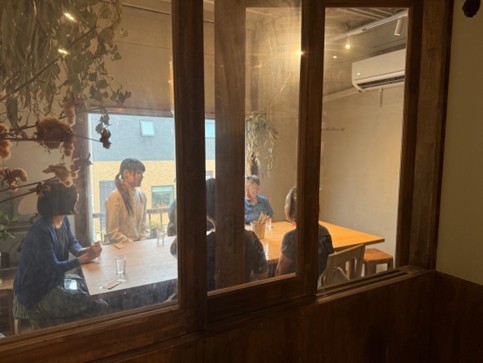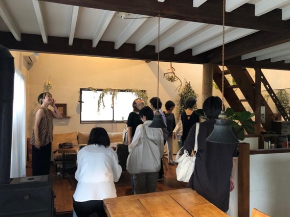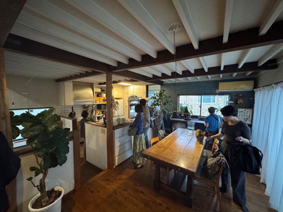 その後、徒歩でシェアハウスへ移動。道すがら、瀬川さんが手がけた別の店舗も通り過ぎる場面がありました。「これも私の設計で、元々はカフェのお客さんだったんです」とのお話に、参加者一同驚きと感動を覚えました。設計が人とのつながりを生み、それが新たな居場所をつくっていく様子に、街と建築の関わりを実感できました。