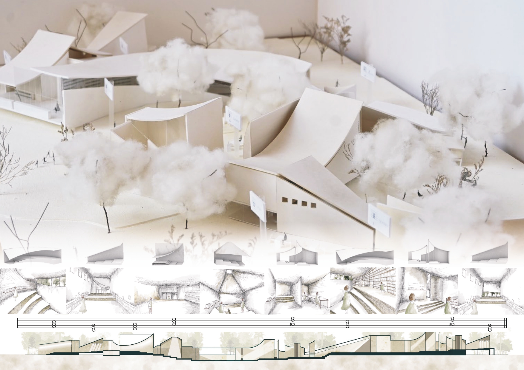 建築は機能を処理するインフラの一部と位置づけられ、建築が本来持つ経験・感覚的な価値が軽視されている。一方私たちは「音楽」を聴いている時にそこに意味を読み取ろうとはせず、純粋な印象をそのまま受け取る。本提案は、こうした音楽のあり方や懐かしいという情緒から建築を捉え直すことで、建築が意味に変換されるその前、人間の感覚に直接働きかける存在となる。これからも建築に対して問い続ける姿勢を忘れずに向き合っていきたいです。