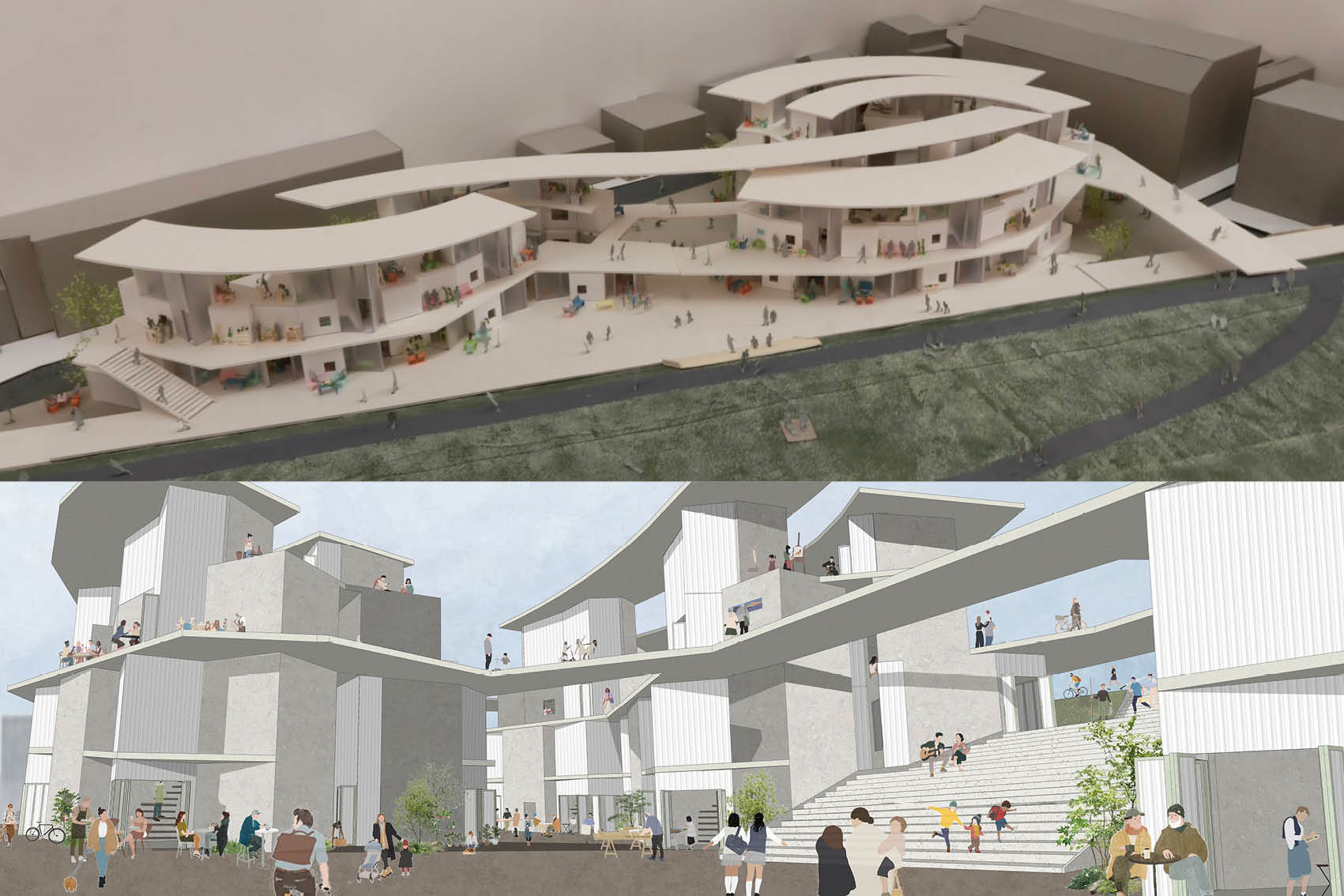 多摩川沿いの土手に計画し、河川敷と住宅街をつなぐ交流拠点を形成。各住戸に内包した店を半公共的空間として位置づけ、通りと路地を段階的に連続させることで、住むことと働くことが重なり合う環境をつくりました。様式は違いがありながらも様々な国の共通文化といえる市場を軸に共助システムを構築し、多文化共生が進む都市のアイデンティティの創出を目指した提案です。