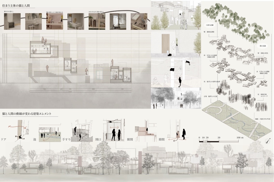 アントロポセンの現在、住まいは人間中心の制度によって形づくられ、他種の生は選別されてきた。本計画は保護猫の殺処分を背景に、動物と人間の関係を建築によって再編する集合住宅の提案だ。猫の行動特性や社会化の段階を空間構成に組み込み、猫の選択動線と人間の生活動線が交差し、両者の媒介となる建築を目指す。内部と外部を連続させた猫庭や立体的な移動ネットワークにより、猫が自ら距離や居場所を選択できる環境を整える。
